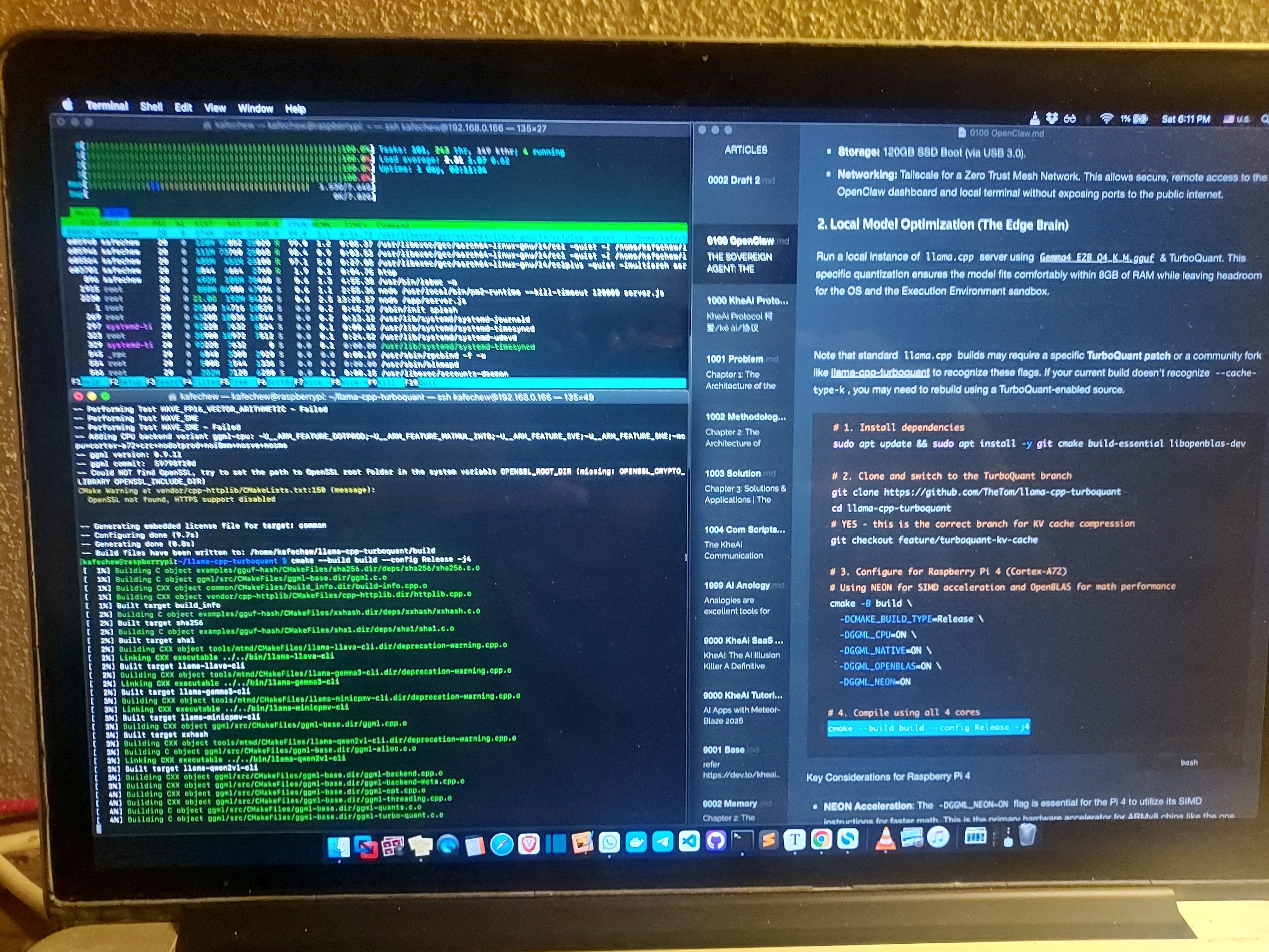 llama.cppfeaturing TurboQuant, which dynamically compresses the model's "short-term memory" (KV Cache), preventing our Pi from crashing during long conversations. - The Soul (KheAi Protocol): Instead of a generic "hacking" persona, we will govern our OpenClaw agent using the KheAi Protocol—a framework for Systemic Autonomy. This gives the agent a structured, ethical, and goal-oriented operating system.